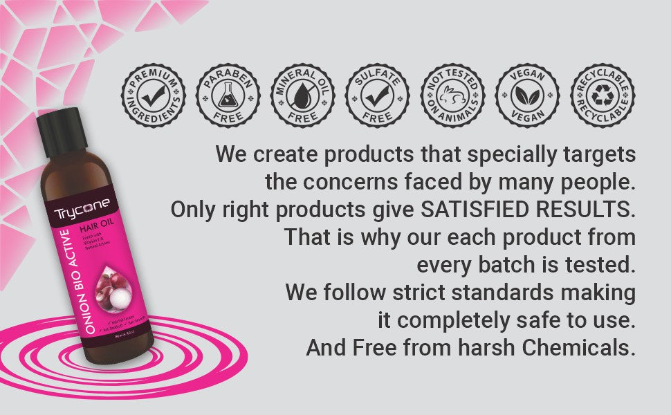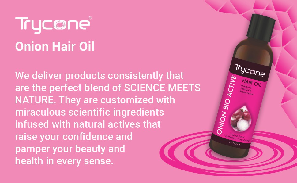Trycone Onion Hair Oil – is formulated with Red Onion, Vitamin E and many other Natural Actives which minimize breakage and helps in hair growth. Its anti-bacterial, anti-inflammatory, and antiseptic properties nourish hair follicles and restores nutrients. It also fights dandruff, promotes hair growth, increases strength and volume, reduces grey hair and protects against lice. And give your hair a healthy shine, which can become permanent when used regularly.